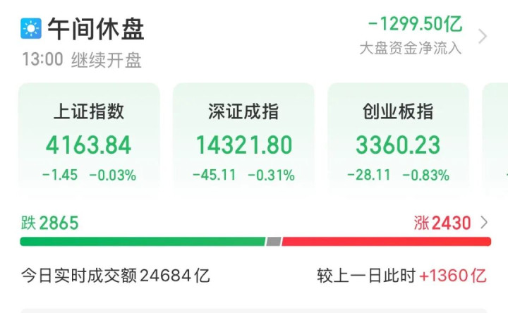 1月13日早盘灵菲配资,A股市场震荡。截至午间收盘,上证指数微跌0.03%,深证成指跌0.31%,创业板指跌0.83%,科创综指跌1.55%。沪深北三市半日成交额达24684亿元。